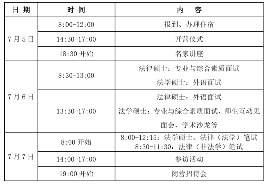 注:知识产权法(三年制理工农医背景)法学硕士日程安排为:7月5日安排如上表;7月6日参观图书馆等;7月7日8:00-12:15笔试,14:00-17:00面试,19:00参加闭营招待会。